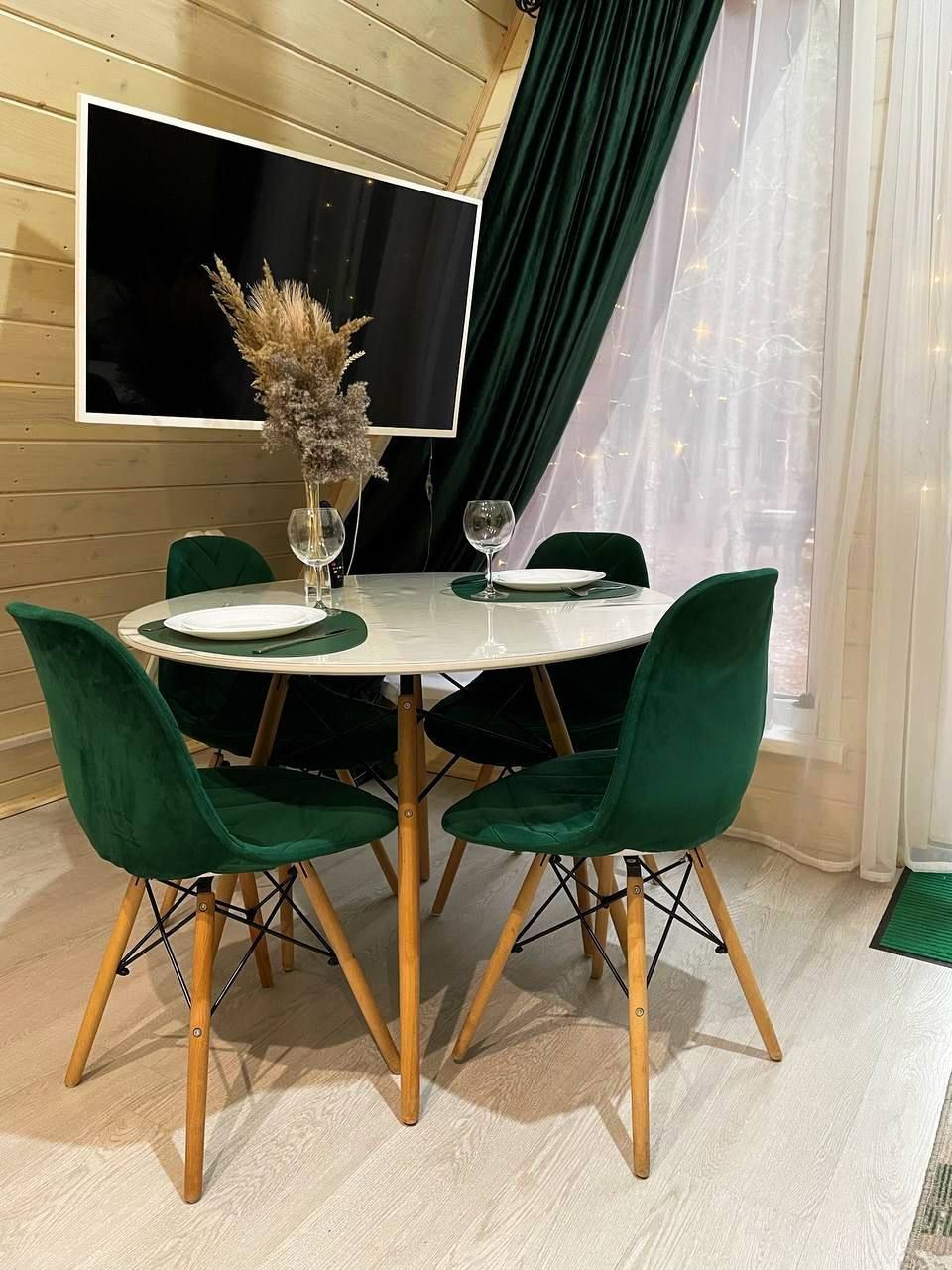 💚 Интерьер в светлых тонах с изумрудными акцентами: бархатные стулья, подушки, текстиль.