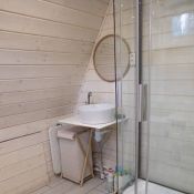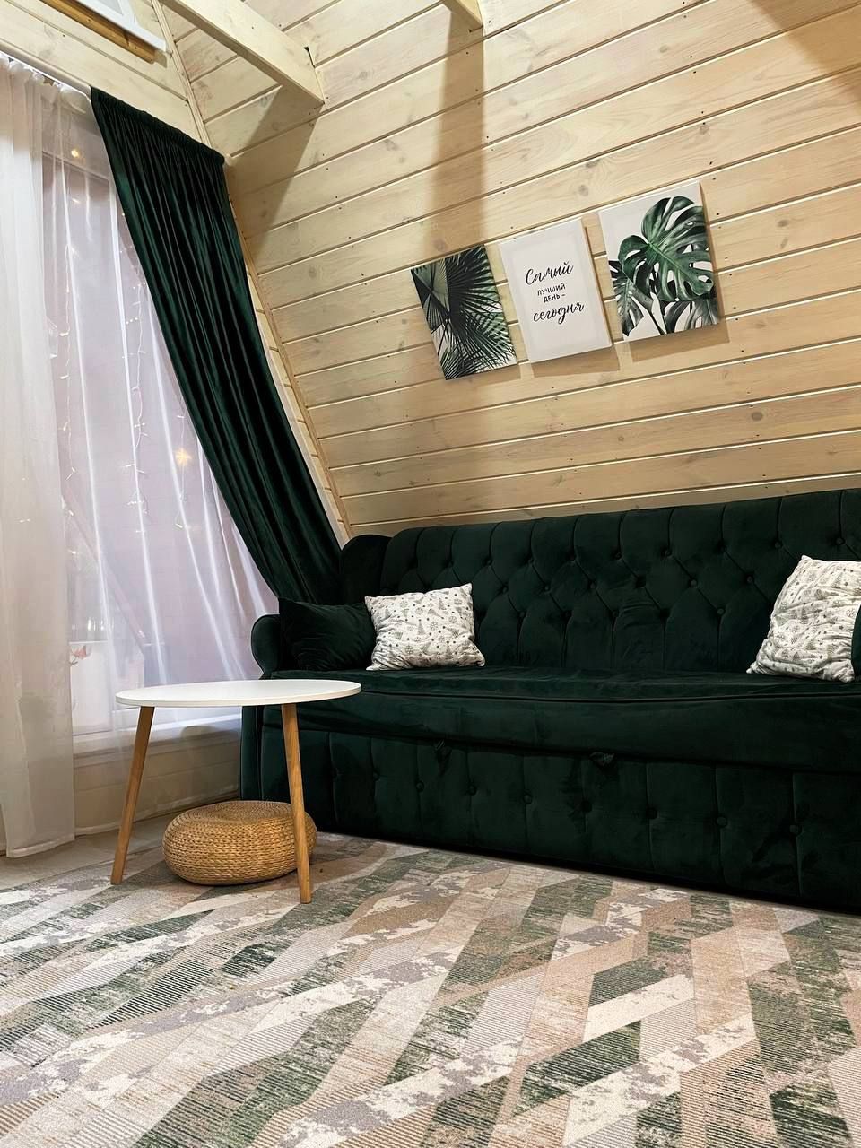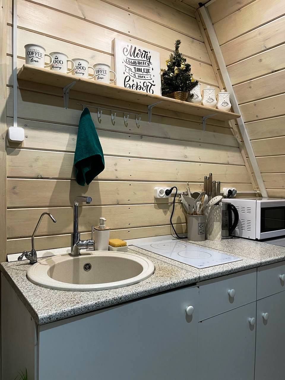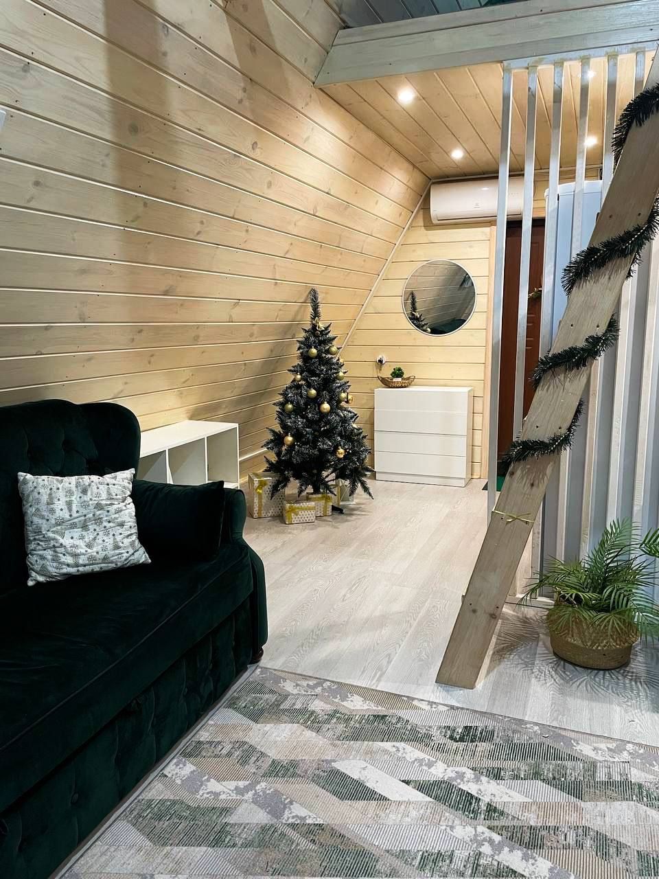 🏡 На первом этаже — кухня со всем необходимым, обеденная зона у окна, мягкий диван, уютный санузел с душем и тёплой отделкой деревом.