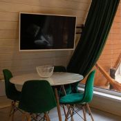 — Стоит в окружении сосен, с большим треугольным панорамным окном во всю стену